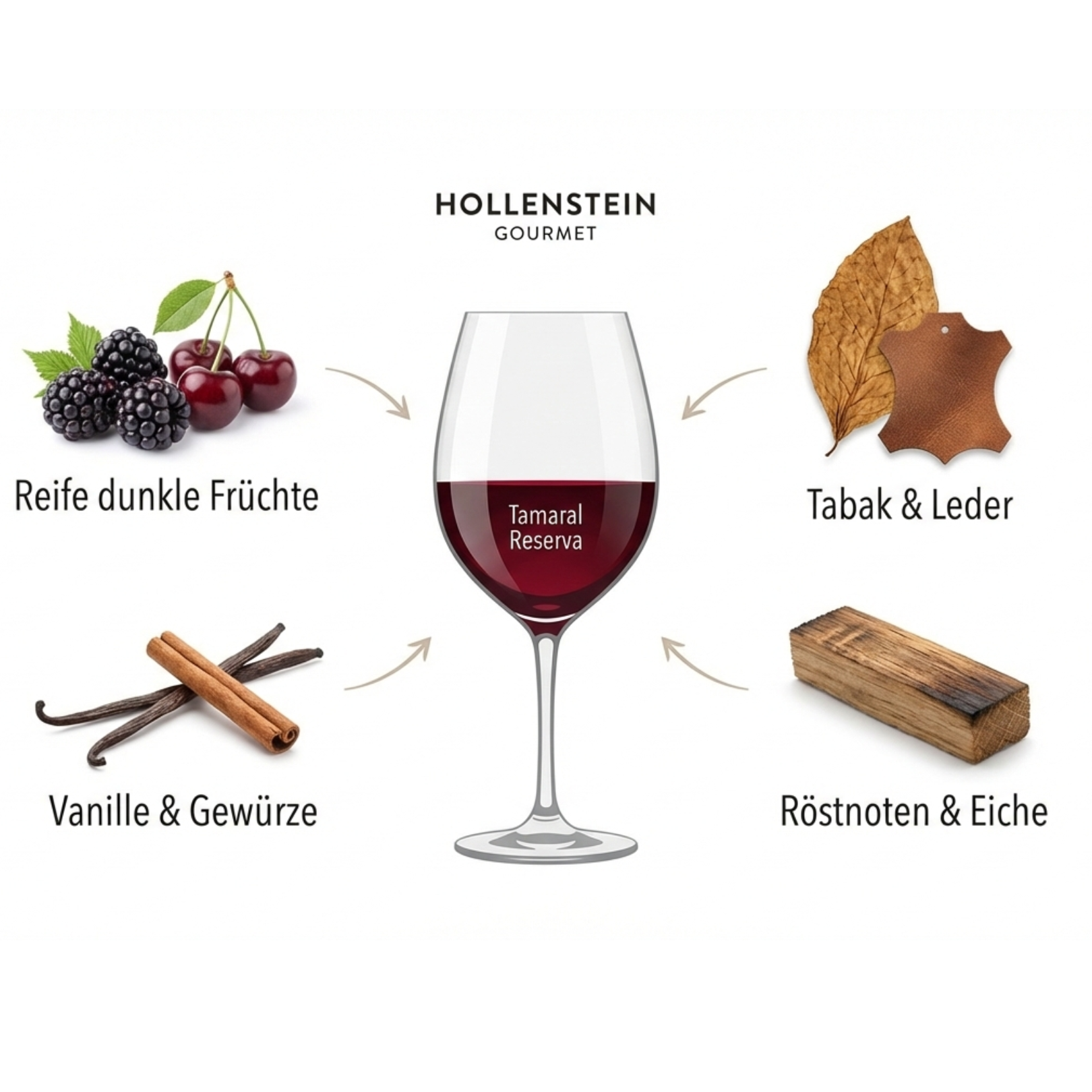 Nase: Ein komplexes Bouquet von reifen schwarzen Früchten, Brombeerkonfitüre, fein verwoben mit edlen Röstnoten, Tabak, Leder und einem Hauch von Vanille.
